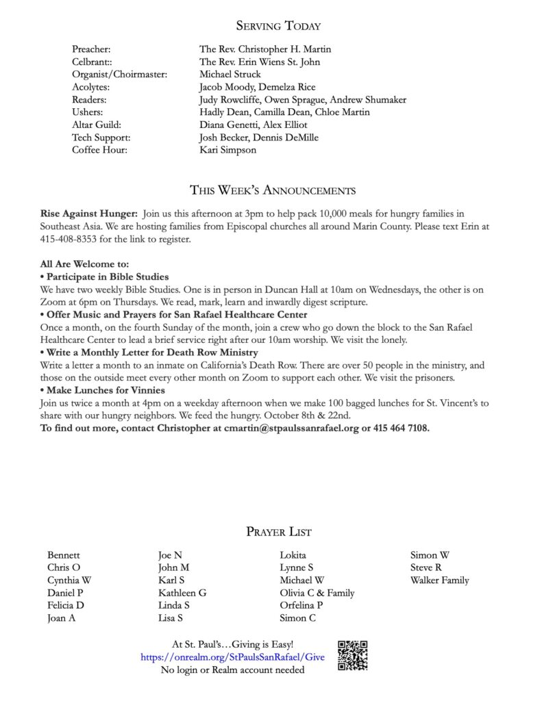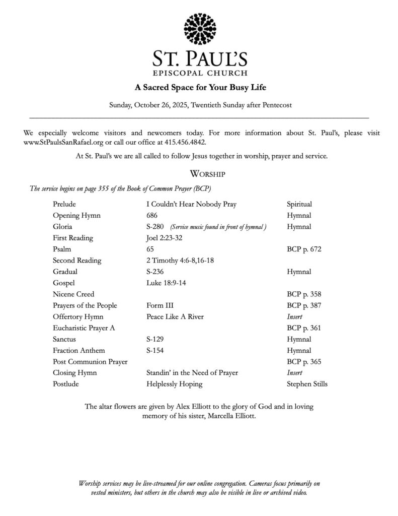 Bulletin 10.26.25 October 24, 2025 Save PDF Click on PDF above to save bulletin.Livestream:Facebook — https://www.facebook.com/stpaulssanrafaelYouTube — https://www.youtube.com/channel/UCwdMKliDwgkJ7b-gqXpbS-A