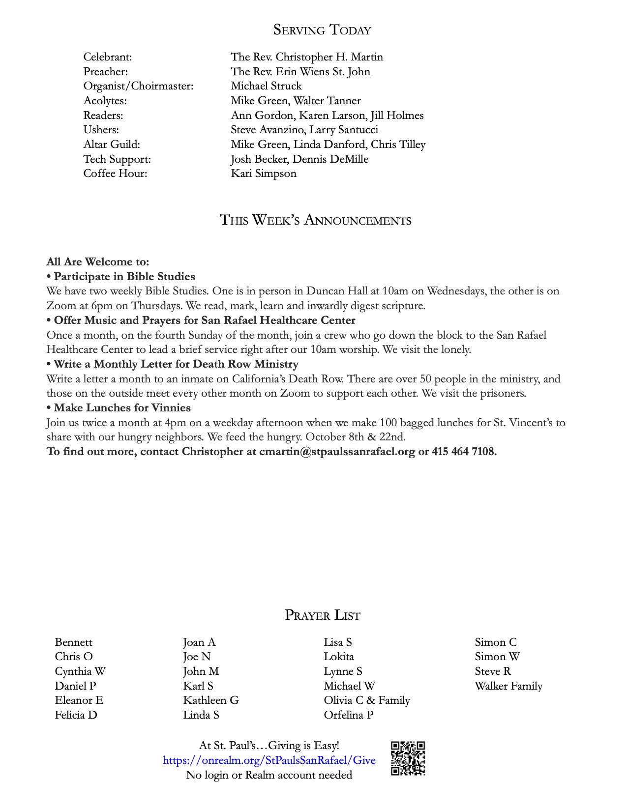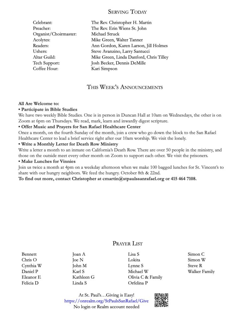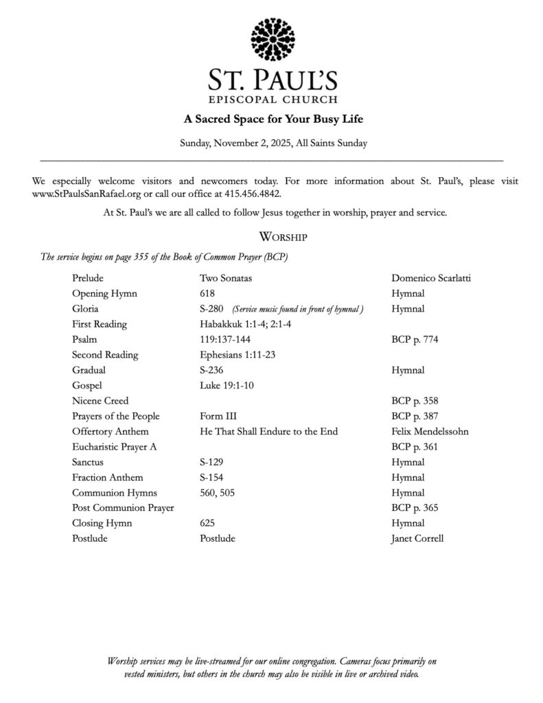 Bulletin 11.2.25 November 1, 2025 Save PDF Click on PDF above to save bulletin.Livestream:Facebook — https://www.facebook.com/stpaulssanrafaelYouTube — https://www.youtube.com/channel/UCwdMKliDwgkJ7b-gqXpbS-A