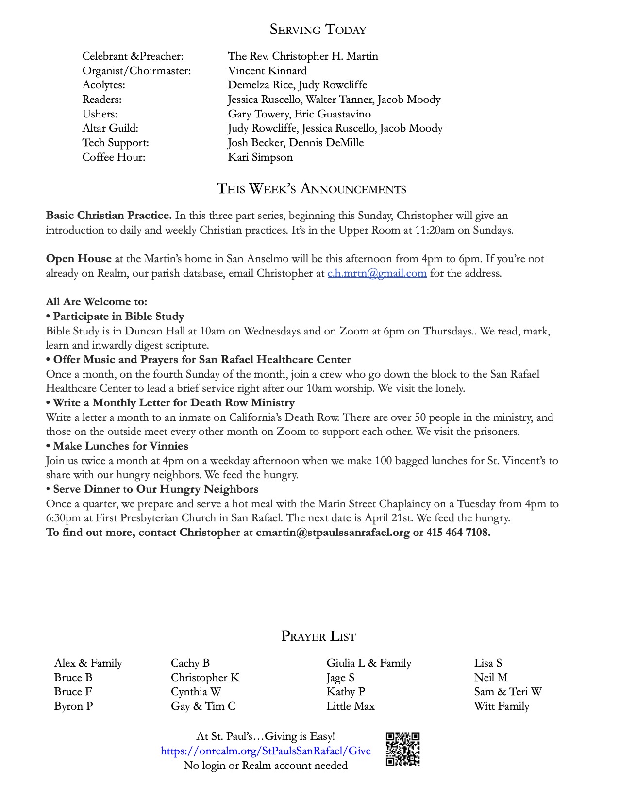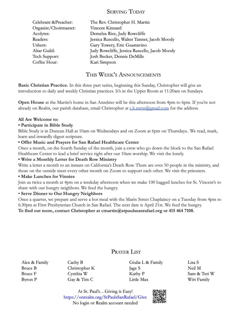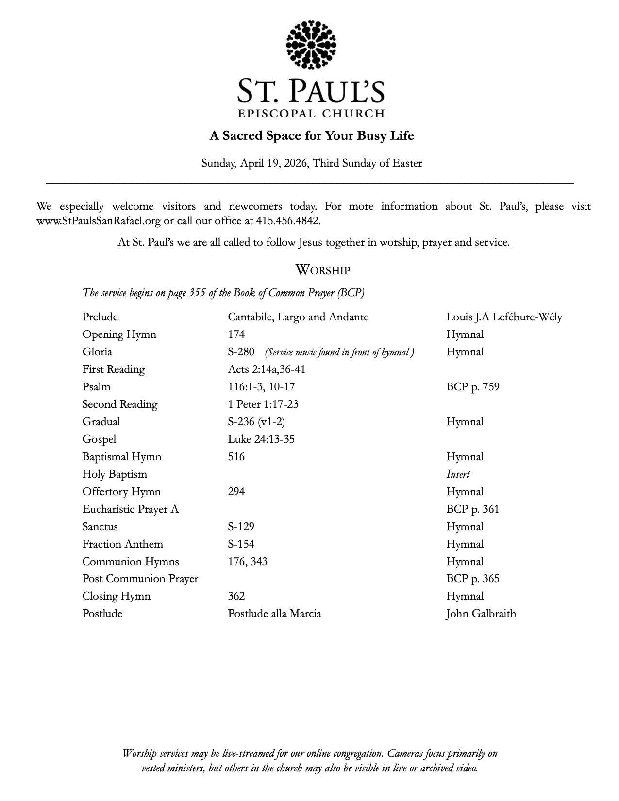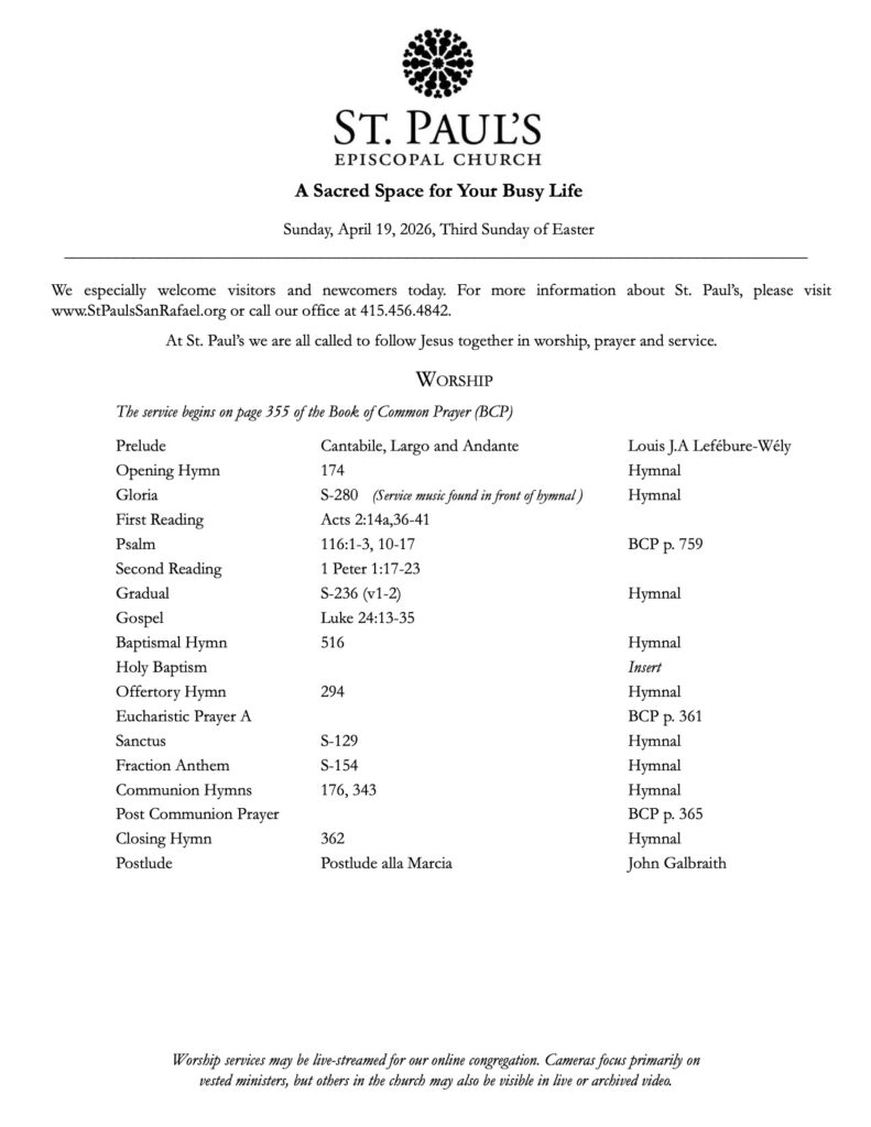 Bulletin 4.19.26 April 15, 2026 Save PDF Click on PDF above to save bulletin.Livestream: Facebook — https://www.facebook.com/stpaulssanrafaelYouTube — https://www.youtube.com/channel/UCwdMKliDwgkJ7b-gqXpbS-A