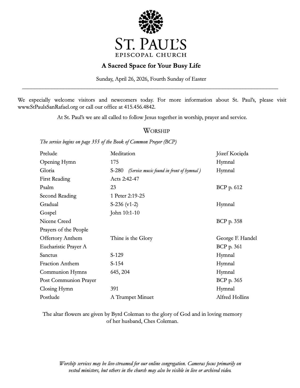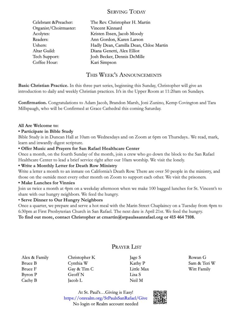Bulletin 4.26.26 Yesterday Save PDF Click on PDF above to save bulletin.Livestream: Facebook — https://www.facebook.com/stpaulssanrafaelYouTube — https://www.youtube.com/channel/UCwdMKliDwgkJ7b-gqXpbS-A