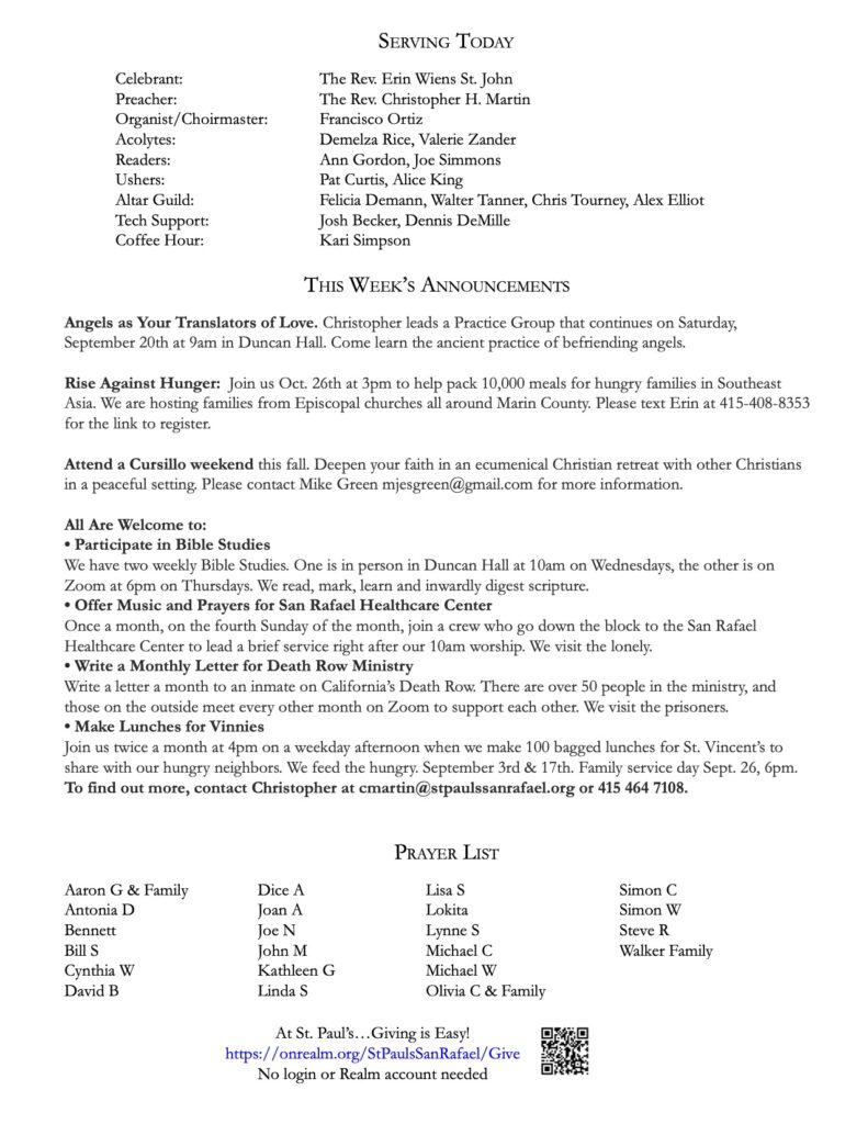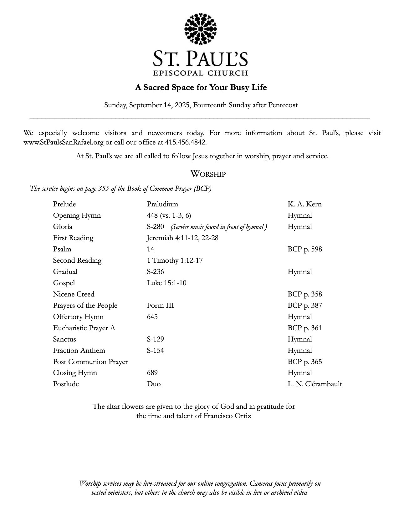 Bulletin 9.14.25 September 12, 2025 Save PDF Click on PDF above to save bulletin.Live stream is here.